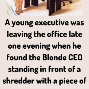 A young executive is leaving the office late one evening, when he finds the blonde CEO standing in front of a shredder with a piece of paper…